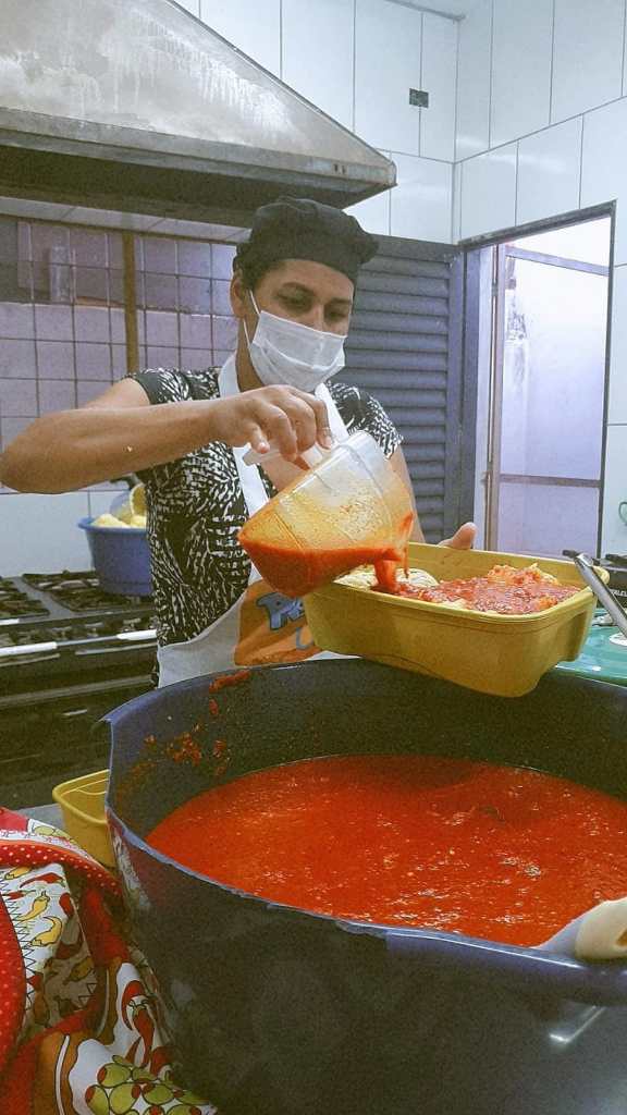 No dia 22, o cardápio escolhido foi polenta e macarrão com molho de tomate acompanhados da sobremesa de batata doce. Tudo foi preparado por Andreia Fátima Moura de Oliveira (41), tesoureira e cozinheira do Periferia, com o auxílio da voluntária Lucia Maria Ferreira (49), moradora do Nicéia há 29 anos que aceitou participar do movimento de forma temporária para ajudar as famílias do bairro.