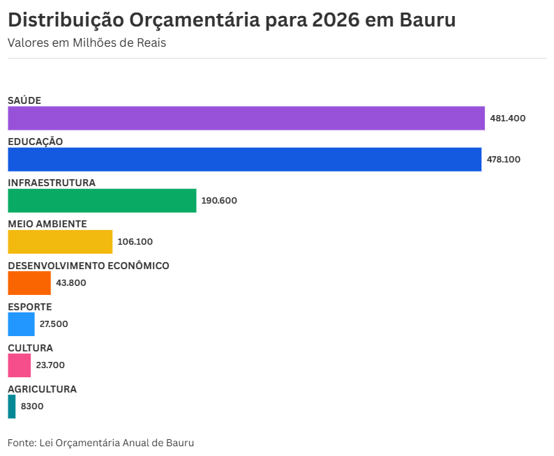 A Secretaria de Cultura deve trabalhar com quase R$3 milhões a menos do que em 2025. Parte da redução se deve à criação da nova Secretaria de Comunicação e Eventos, que passou a concentrar algumas atribuições antes ligadas à Cultura. O orçamento será aplicado em ações de preservação do patrimônio histórico, manutenção de bibliotecas e do Teatro Municipal, incentivo a grupos culturais e execução da Política Nacional Aldir Blanc – responsável por promover o desenvolvimento cultural em todo o Brasil.